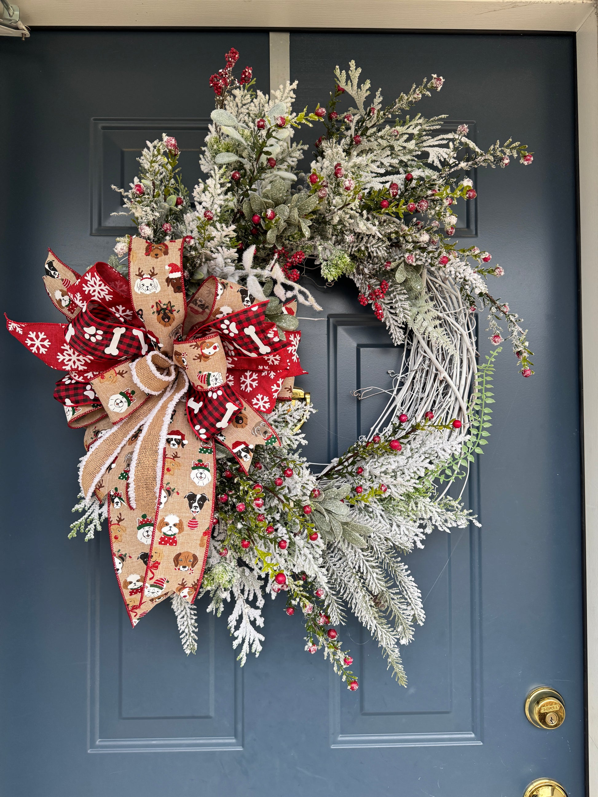 winter wreath with dog themed bow